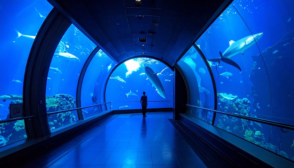 頭上を悠々と泳ぐエイやサメ。 360度を包み込む青い世界に、一歩足を踏み入れた瞬間、まるで海の中を散歩しているような気分に。 光のゆらめきと魚たちの群れが、非日常の世界へと誘います。