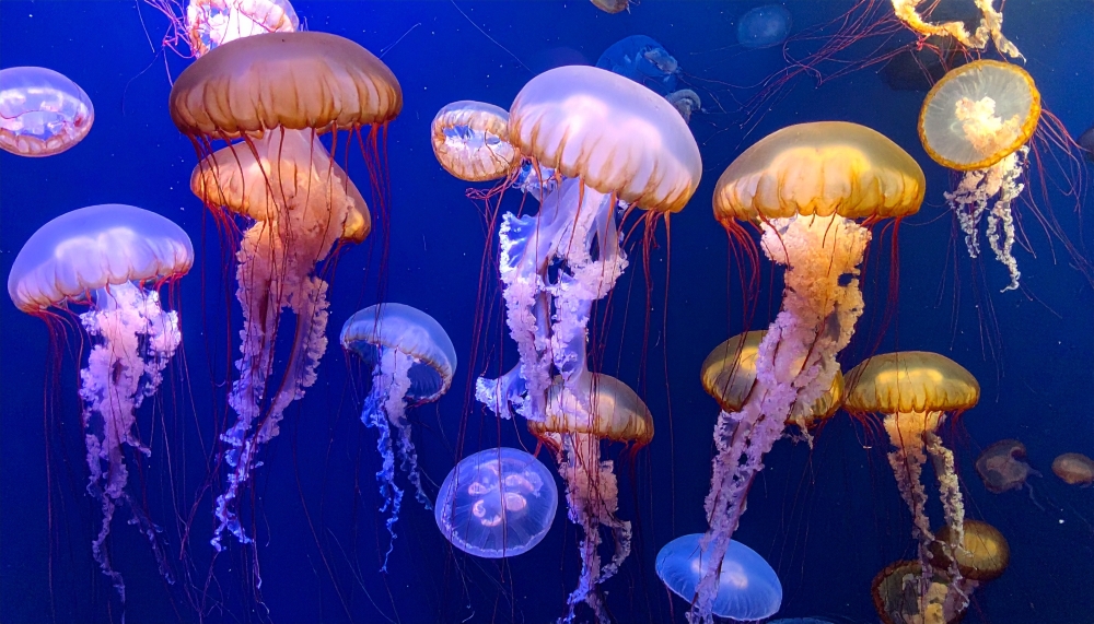 光に溶けるように漂うクラゲたち。 透き通る体とゆらめく触手が、青い水槽の中で幻想的な世界を描きます。 昼と夜で変わるライティングに包まれ、あなたも“水の夢”に触れてみませんか。